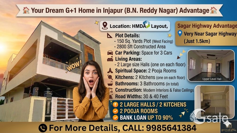 ๐ *๐ Independent House* for *Sale* @ *Injapur*, Near B.N. Reddy, *Vanasthalipuram* ๐ Prime Location | Near Bachpan School | HMDA Layout ๐น Plot Area: *150 Sq Yards* (30x45) ๐น Facing: *West* ๐น Built-up Area: *2800 Sq.ft* ๐น Road Width: *30* Ft ๐๏ธ Construction Details: โข Ground Floor: *1BHK* + *2 Car Parking* 2Large Halls with Dual kitchens With Dual Pooja Rooms.and 3 Bathrooms โข 1st Floor: *2BHK* ๐ฐ Price: *โน1.16Cr (Negotiable Price:- 1.10Cr) ๐ฆ Loan: Up to 90% Bank Loan Available ๐ Down Payment: Only 10% โ Clear Title โ Prime Residential Location โ Peaceful Neighborhood โ Close to Bachpan School & All Amenities *Contact me:- 9985641384*