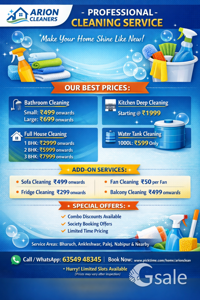 Arion Cleaners – Bathroom Cleaning Service Shop No. 105, Corner Avenue, Chavaj, Bharuch, Gujarat – 392001 India We provide expert bathroom cleaning services with deep cleaning, stain removal, tile scrubbing, and sanitization. Our trained staff uses professional tools and safe chemicals to make your bathroom fresh, hygienic, and germ-free.