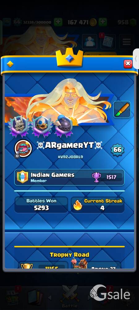 ๐ฐ Tower Level: 15 ๐ Arena: 27 ๐ Cards: All cards unlocked ๐ Emotes: 121 / 300 collected ๐ Account Status: Well-maintained & high progress ๐ฐ Price: 45k Serious buyers only. DM if interested. Fast deal ๐