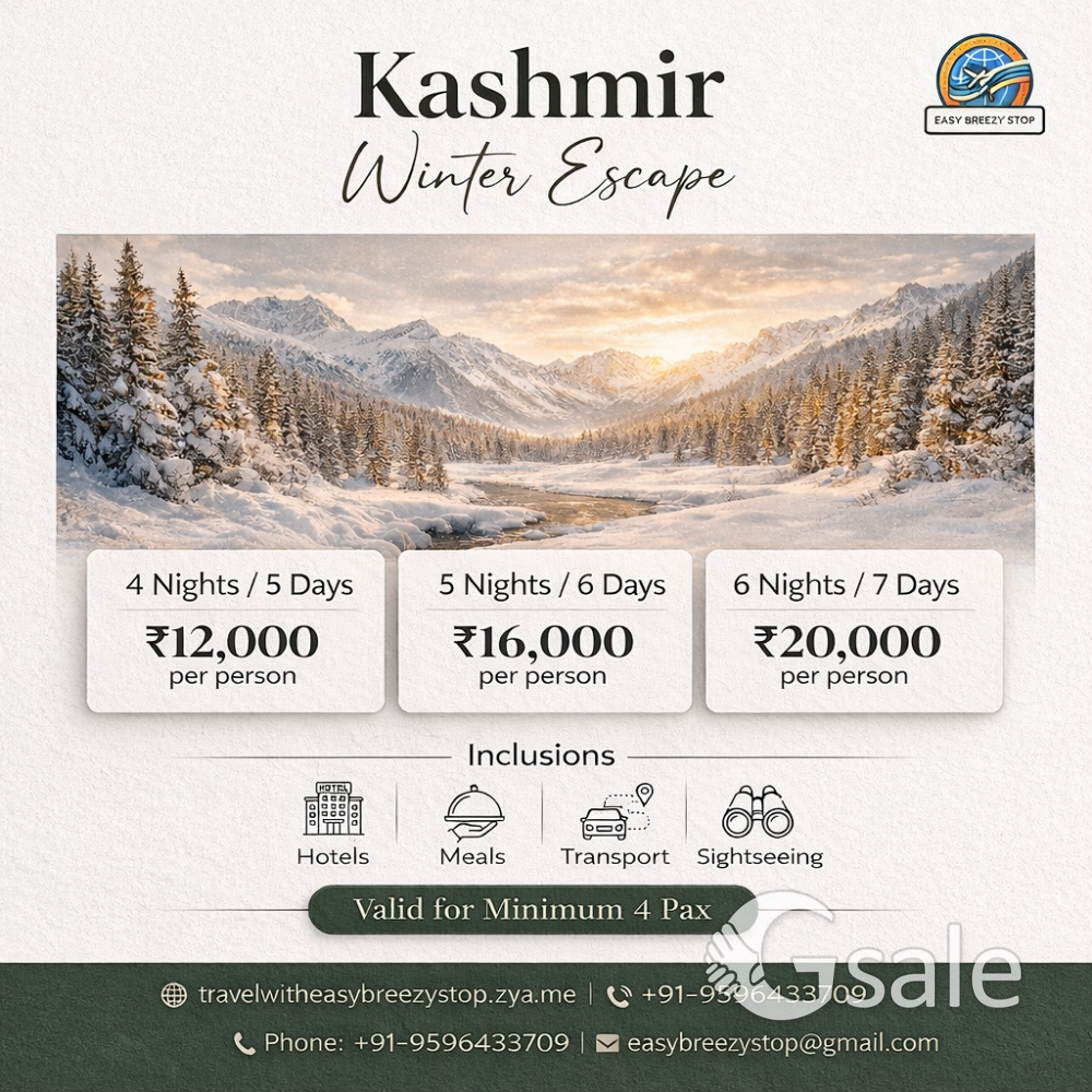 Imagine 0°C mornings with hot Kashmiri Kehwa, a private shikara ride through the frozen Dal Lake, and the soft "crunch" of fresh snow in Gulmarg. This isn't just a trip; it’s your 2026 winter escape. What we offer: ✅ Luxury Stays: Handpicked 4-star hotels & premium houseboats. ✅ Seamless Travel: Airport transfers, private AC vehicles, and 24/7 local support. ✅ Curated Experiences: Gondola rides in Gulmarg, Pahalgam valley tours, and hidden gems. ✅ Safety First: Verified drivers and experienced local guides. Global Services: Beyond Kashmir, we handle your Air Ticketing, Visas, and Travel Insurance worldwide. #KashmirTour2026 #GulmargSnowfall #KashmirHoneymoon #EasyBreezyStop #TravelKashmir #SrinagarPackages