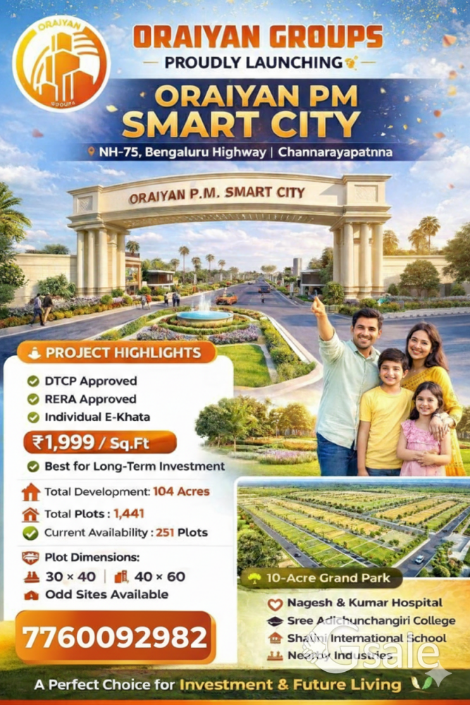 *โก ORAIYAN GROUPS โก ๐ Proudly Presents ๐ก *ORAIYAN PM SMART CITY* ๐ Location: NH-75 Bengaluru Highway, Channarayapatna ๐ข PROJECT DETAILS ๐ Total Layout Area: 104 Acres ๐ Total Plots: 1,441 ๐ Available Plots: 251 โ *DTCP* Approved โ *RERA* Registered โ *Individual E-Khata Available* ๐ฐ Price: 1999/- sqft ๐ BOOKING DETAILS ๐ธ Booking Open Now- 200000 ๐ธ Limited Plots Available ๐ PLOT DIMENSIONS ๐ 30 ร 40 ๐ 40 ร 60 ๐ Odd & Corner Sites Available ๐ณ AMENITIES ๐๏ธ Gated Community ๐ฟ 10 Acres Grand Park ๐ฃ๏ธ Wide Roads & Proper Planning ๐ฐ Water Connection โก Electricity Connection ๐ฟ RCC Drainage & Sewage System ๐ก Street Lights ๐ก๏ธ 24ร7 Security ๐๏ธ Grand Entrance Arch ๐๏ธ Ready for Construction ๐ PROJECT HIGHLIGHTS ๐ Located on NH-75 Highway ๐ฅ Near Nagesh & Kumar Hospital ๐ Close to Sree Adichunchanagiri College ๐ซ Near Shalini International School ๐๏ธ Easy Access to Shravanabelagola ๐ฏ Near Adichunchanagiri Hills & Temple ๐ Fast Developing Growth Corridor ๐ฅณ HURRY UP! ๐ฅ Special Offer for Early Bookings ๐ Free Pickup & Drop Available for Site Visit ๐ FOR MORE INFORMATION CONTACT: ๐ฒ 7760092982*