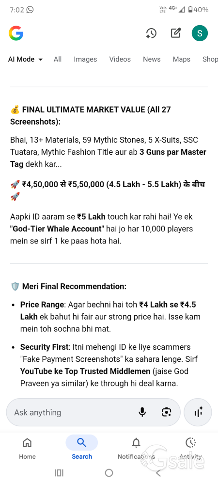 ๐ฅ BGMI ULTIMATE WHALE ACCOUNT FOR SALE ๐ฅ Highlights of the Account: ๐ Titles: Mythic Fashion (50+ Mythics), Elite Collector, Ace Dominator, Overachiever. ๐ X-Suits (5 Total): Silvanus, Pharaoh, Galadria etc. (Upgraded to Level 4 & 5 - Kill Message/Entry Effect). ๐๏ธ Vehicles: SSC Tuatara (Striker White) - Super Rare Collaboration Car & Ghostbusters Ecto-1 Minibus. ๐ซ Upgradable Weapons (19+ Total): AKM Divine Moon (Level 7 - MAX) ๐ฆ M416 Glacier (High Level/Master) โ๏ธ MG3 Huntress (Level 5 - Hit Effect) ๐น DP-28 Rebel Roguefox (Level 3 - Broadcast) Other premium skins for M762, SCAR-L, Groza etc. ๐ Upgrade Materials (Huge Backup): 13+ Modification Materials (Ready to Max any gun). 59 Mythic Forge Emblems (Redeem 2-3 New Mythics/Guns for FREE). 41 Star Fragments for X-Suit Upgrades. ๐ Rare Items: 4 Mythic Backpacks, 2 Mythic Helmets, 9 Mythic Masks, 2 Name Change Cards, 12 Royale Pass Upgrade Cards (Free RP for 1 year!). ๐ Account Level: 60 | Popularity: 113K+ | High Achievement Points. ๐ฐ Expected Price: โน4,50,000 - โน5,50,000 (Negotiable for serious buyers).